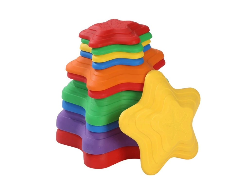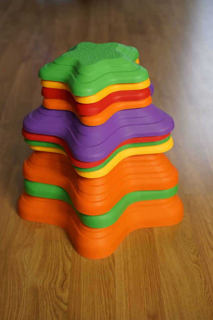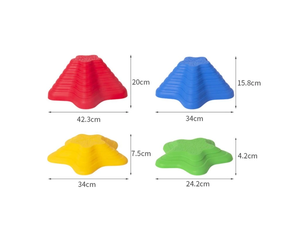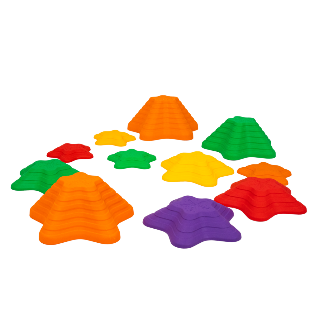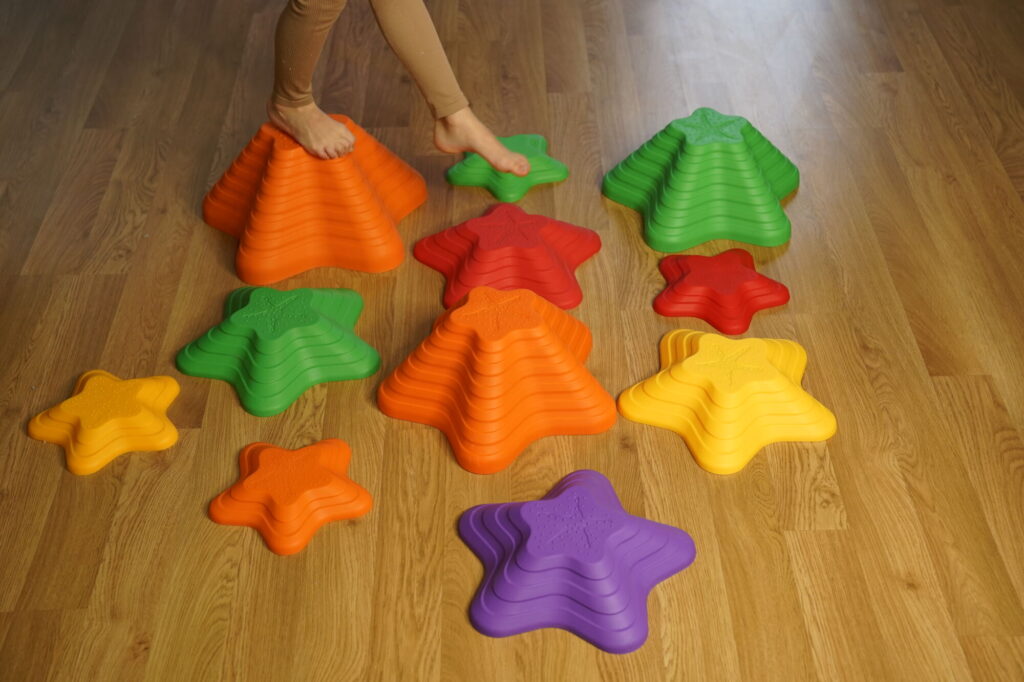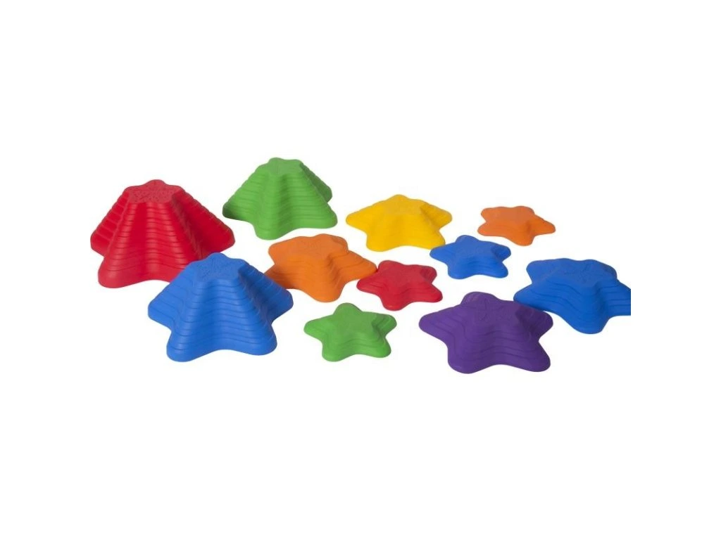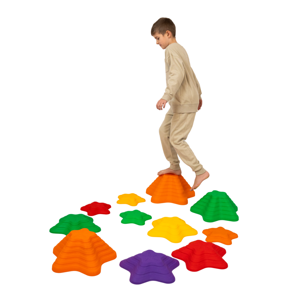 Sada 11 nášlapných kamenů ve tvaru hvězdic pro aktivaci klenby nohou/rukou a středu těla. Ideální pomůcka pro rozvoj dětské rovnováhy, propriocepce a fasciální masáž. Hvězdice mají multifunkční využití pro domácí prostředí, tělocvičnu i zahradu. Díky rozmanitým barvám jsou ideální pro stavění balančních cestiček a opičích drah! Inspiraci na cvičení najdete na mém IG/FB. Sada obsahuje 11 typů kamenů - modré, červené, zelené, oranžové, žluté a fialové barvy. Kameny jsou vyrobené z odolného materiálu s protiskluzovým povrchem a splňují evropské bezpečnostní normy – mají CE certifikát, takže jsou vhodné i pro profesionální využití v institucích.