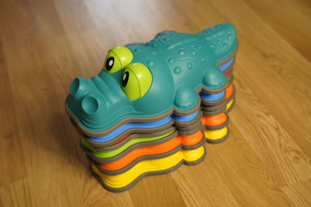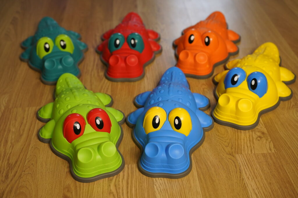 Barevné krokodýly s protiskluzným povrchem mají rozměr 41 × 22 × 10 cm a v sadě je 6 ks. Unikátní jsou výměnné oči, díky kterým si děti mohou vytvářet různé výrazy a při hraní zapojit i fantazii.