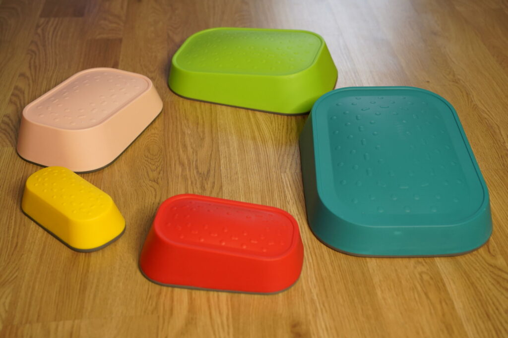 Sada 5 nášlapných ploch se sešikmeným a senzorickým povrchem pro aktivaci klenby nohou/rukou a celkovou tělesnou koordinaci a napřímení. Ideální pomůcka pro rozvoj dětské rovnováhy, propriocepce a fasciální masáž! Nášlapné plochy mají multifunkční využití pro domácí prostředí, tělocvičnu i zahradu. Rozdílné textury určené k stimulaci hmatu a podpoře aktivního pohybu. Díky rozmanitým barvám jsou ideální pro stavění balančních cestiček a opičích drah! Inspiraci na cvičení najdete na mém IG/FB. Sada obsahuje 6 nášlapných ploch - tmavě zelenou, světle zelenou, žlutou, červenou a světle růžovou. Nášlapné plochy jsou vyrobené z odolného materiálu s protiskluzovým povrchem a splňují evropské bezpečnostní normy – mají CE certifikát, takže jsou vhodné i pro profesionální využití v institucích.