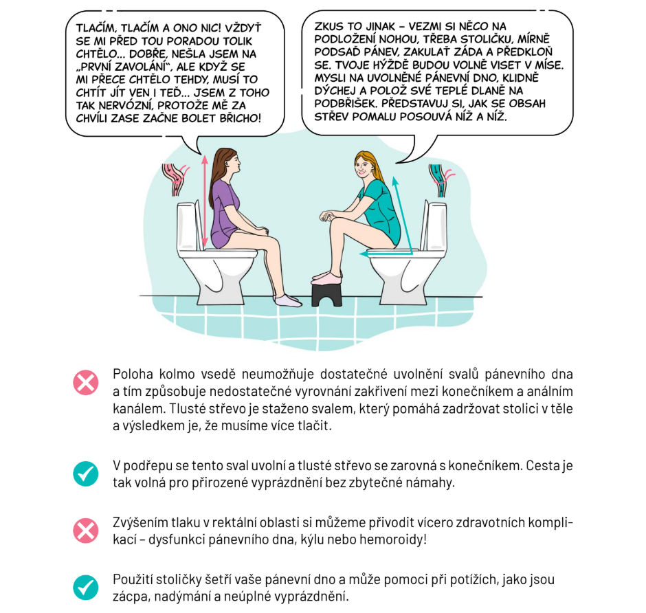 Pro každou ženu - šetřete své pánevní dno! Poloha kolmo vsedě neumožňuje dostatečné uvolnění svalů pánevního dna a tím způsobuje nedostatečné vyrovnání zakřivení mezi konečníkem a análním kanálem. Používání toaletní stoličky na zvýšení nohou napodobuje přirozený dřep, což usnadňuje vylučování tím, že uvolňuje pánevní dno a vyrovnává tlusté střevo s konečníkem. Tato pozice snižuje nutnost tlačit, chrání pánevní svaly před přetížením a pomáhá předcházet problémům jako zácpa nebo inkontinence.